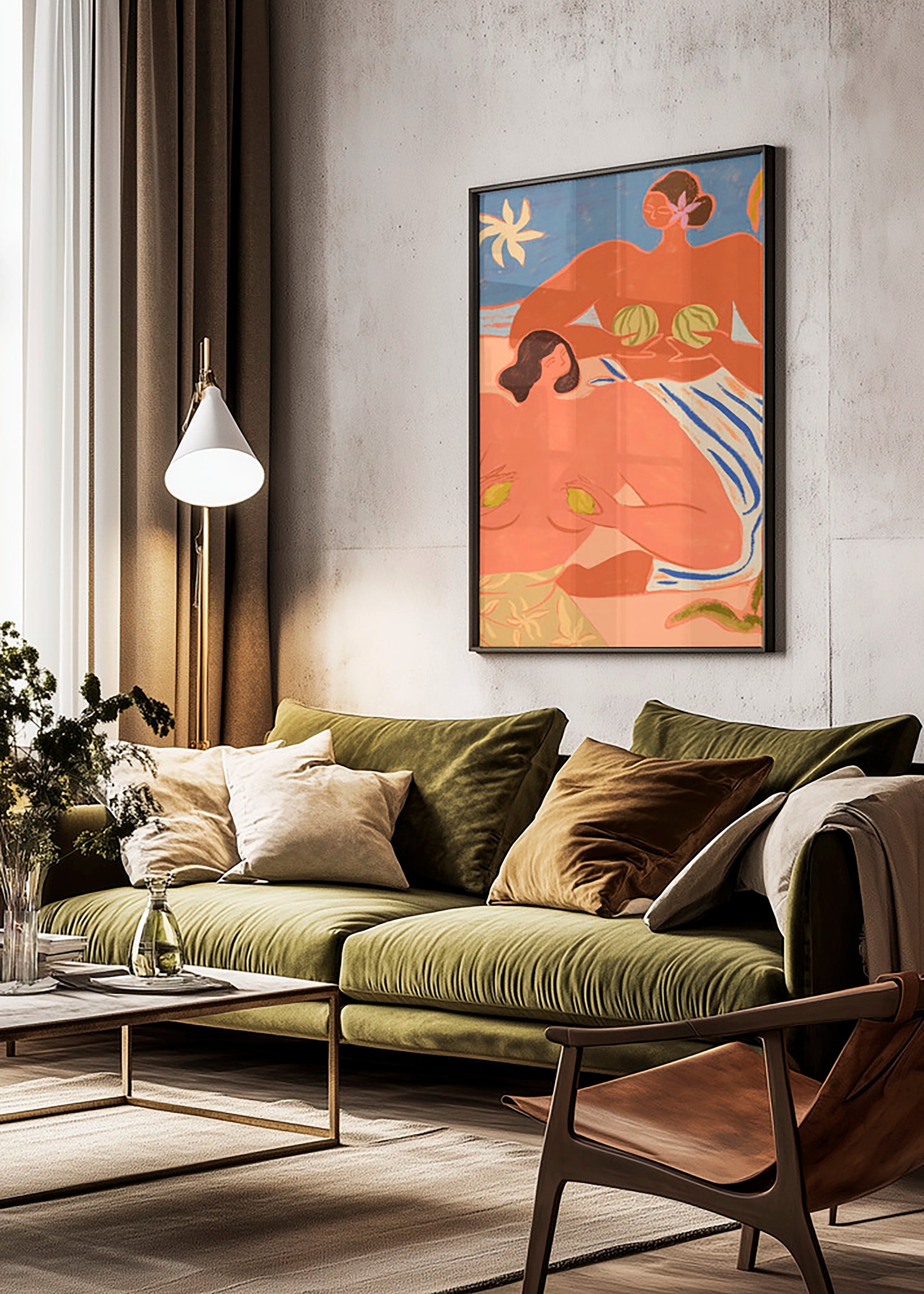 Vor dem Hintergrund sandiger Pfirsichtöne, eines tiefblauen Himmels und Akzenten tropischen Grüns wirkt „Lemon and Melon“ wie ein Fenster in einen endlosen Sommer. Die Farbpalette wird von warmen Orange-, Korallenpfirsich- und erdigen Beigetönen dominiert, die durch leuchtende Grüntöne und ein markantes Kobaltblau kontrastiert werden. Diese Töne erzeugen ein Gefühl von Wärme und Frische und machen das Poster zur perfekten Ergänzung für Interieurs, die Farbe und Persönlichkeit lieben. Ob Sie ein skandinavisch inspiriertes Zuhause mit hellen Holzelementen oder einen Bohème-Stil mit eklektischen Objekten bevorzugen – „Lemon and Melon“ setzt einen markanten Akzent. Dieses Poster eignet sich ideal für Wohnzimmer, wo es zum lebendigen Mittelpunkt wird, Essbereiche, wo es Wärme und Freude ausstrahlt, oder Schlafzimmer, wo es eine verspielte und gleichzeitig entspannte Atmosphäre schafft. Es passt auch hervorragend in kreative Räume wie Studios oder Homeoffices und erinnert Sie daran, Freude und Spontaneität zu bewahren. Erhältlich in den Größen 30 x 40 cm und 50 x 70 cm, ist „Lemon and Melon“ vielseitig gestaltbar. Die kleinere Größe eignet sich perfekt für Bilderwände, während die größere Version für sich allein ein starkes Statement setzt. Für die Rahmung empfehlen wir einen Eichenrahmen, um die erdigen Töne zu betonen, oder einen schwarzen Rahmen, um die grafischen Linien hervorzuheben. Ein Rahmen aus Naturholz passt ebenfalls gut und sorgt für einen harmonischen Kontrast zur warmen Farbpalette.Als Teil der Kollektion von Arty Guava spiegelt Lemon and Melon ihre charakteristische Fähigkeit wider, figurative Kunst mit lebendigem Storytelling zu verbinden. Es ist nicht nur ein Poster – es ist ein Kunstwerk, das Ihr Zuhause in einen fröhlicheren und inspirierenderen Ort verwandelt.